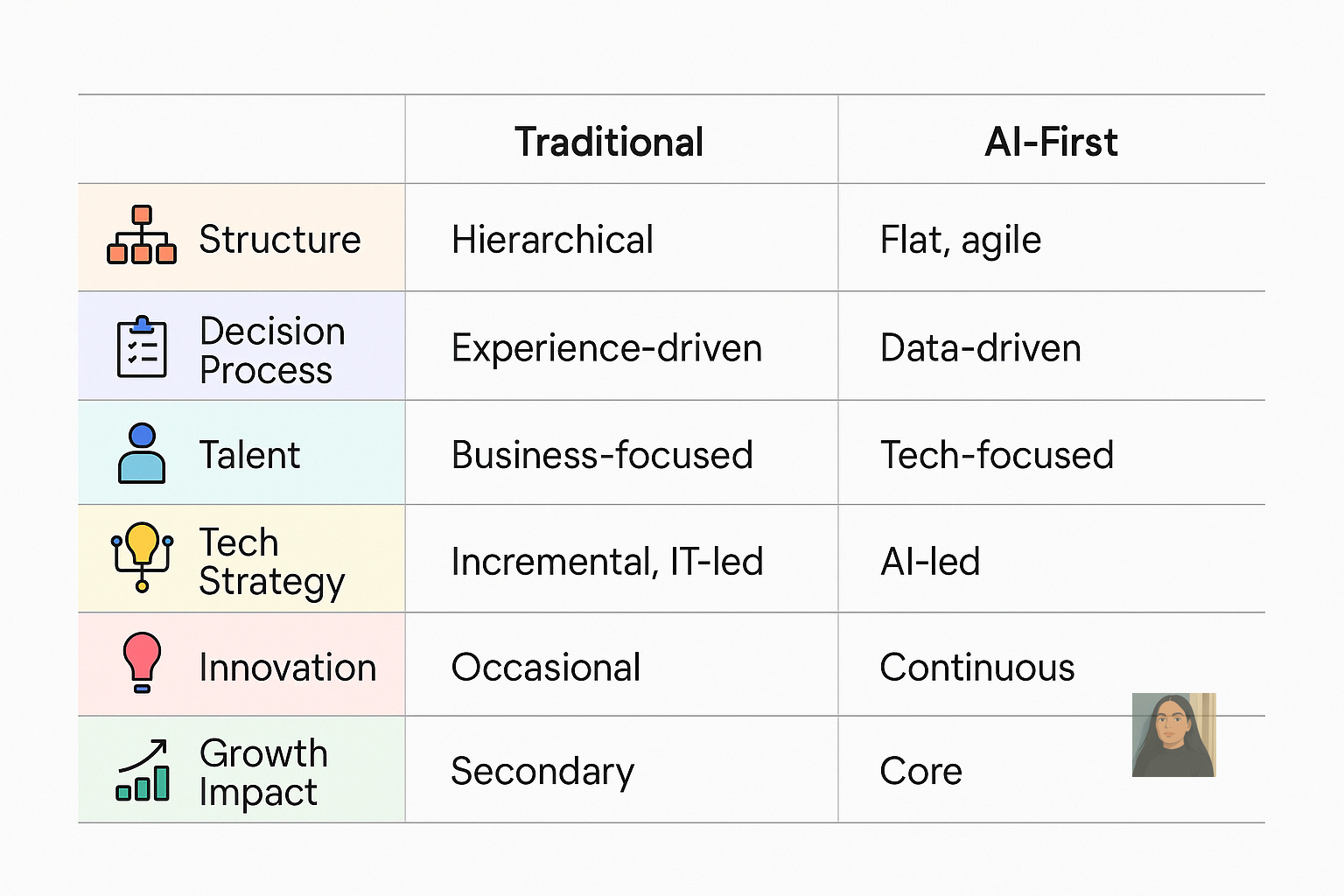 The shift from traditional to AI-First is more than a tech upgrade. It’s a reinvention of how companies grow, innovate, and succeed. For founders, embracing an AI-First approach means adopting a flat, agile structure, supporting data-driven decisions, hiring tech-focused talent, and fostering continuous innovation, by making it the core purpose rather than a secondary goal. Founders who can lead with AI not only just keep up with change will set the pace for the future.